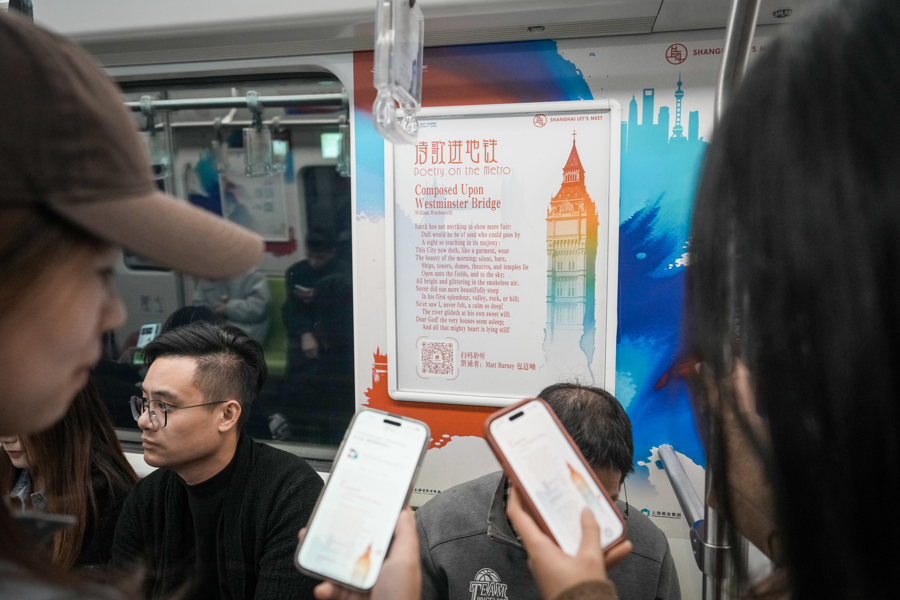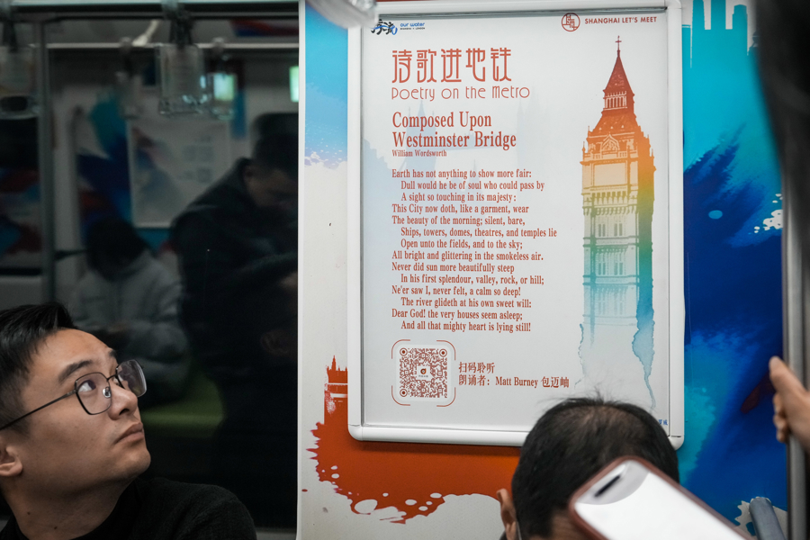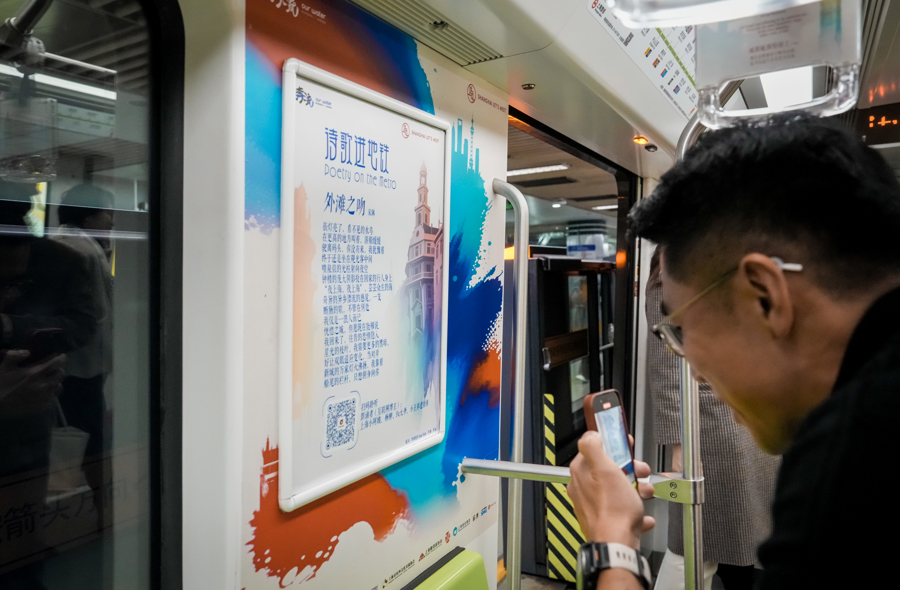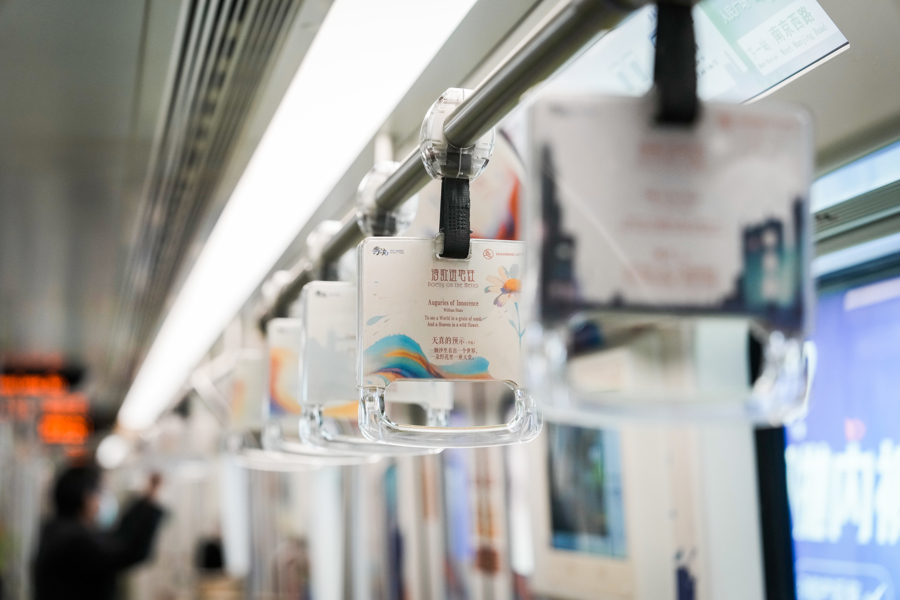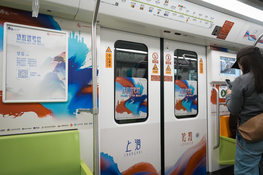 11月19日,乘坐地铁2号线的乘客发现其中一辆列车的车厢、车门及拉手处多了多彩诗歌海报,扫码即可凝听中外嘉宾朗读。当日,“奔流 - 诗歌进地铁”专列在东谈主民广场站首发,8首中英经典诗歌在车厢内展示。