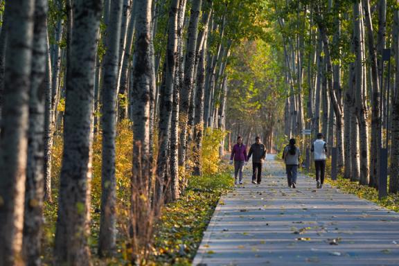 市民在北京市向阳区的向阳绿谈上踱步闲静(2025年11月14日摄)。新华社记者 鞠焕宗 摄