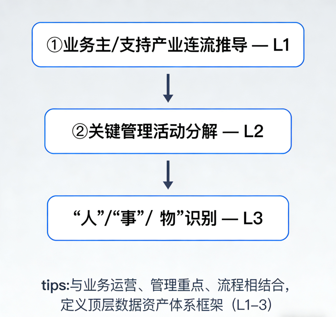 L1主题域分组:若有业务架构(业务历程体系文献),L1可与历程组/业务域保持一致;若无业务架构,参考组织架构、部门及岗亭职责、业务系统区别、行业解释,梳理价值链最高级次详尽得到L1。